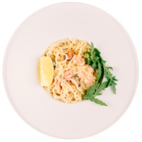 Спагетти, сливки, мидии, креветки, форель подкопченная, сыр, зелень